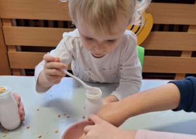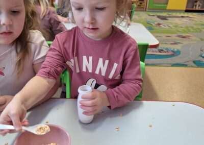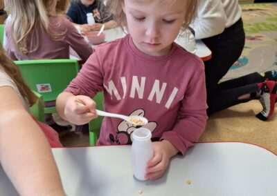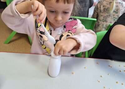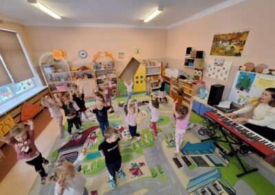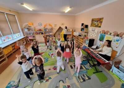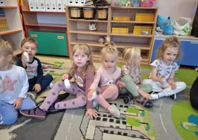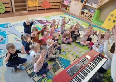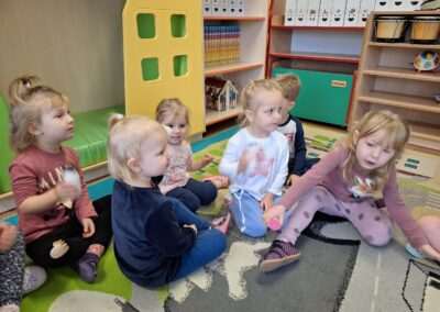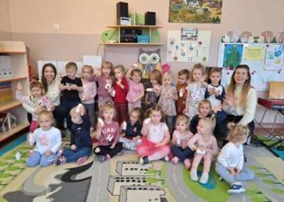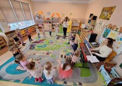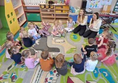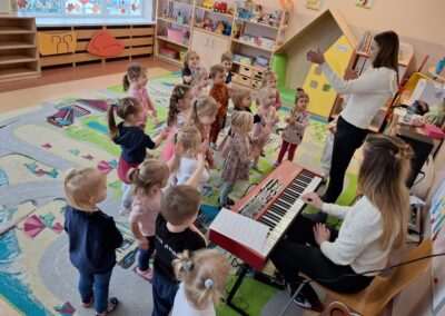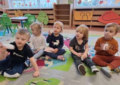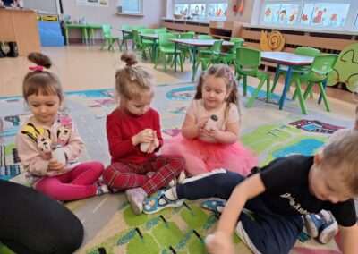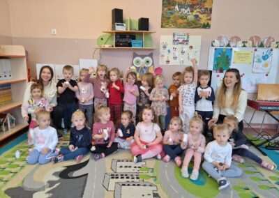 W miniony czwartek w naszym Przedszkolu gościły Przyjazne śpiewanki. Maluszki z grupy Jeżyków i Wiewiórek brały udział w zajęciach umuzykalniających prowadzonych metodą E. E. Gordona. Motywem przewodnim piosenek i zabaw muzycznych była nadchodząca zima. Dzieci śpiewały piosenkę o Świętym Mikołaju, bawiły się w bitwę śnieżną z wykorzystaniem kartek papieru i przygotowywały się do zimowego spaceru. To wszystko przy akompaniamencie muzyki na żywo! Na zakończenie zajęć każdy Przedszkolak wykonał własną grzechotę z grochu wsypanego do buteleczki. Dobrej zabawy nie było końca!