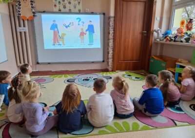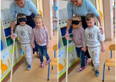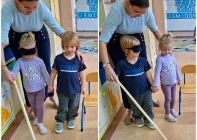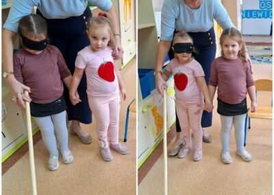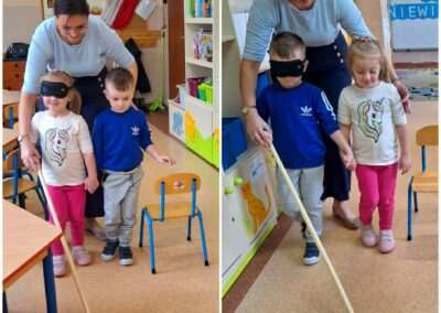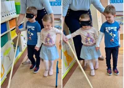 13.listopada obchodziliśmy Międzynarodowy Dzień Osób Niewidomych. Tego dnia przedszkolaki z grupy Jeżyków miały okazję wcielić się w rolę osoby z uszkodzonym wzrokiem. Dzieci poznały Marysię – bohaterkę opowiadania Julii Borkowskiej „W świecie ciemności”. Dowiedziały się kim jest pies przewodnik i do czego służy biała laska. Przedszkolaki rozpoznawały uwypuklone kształty, a także pokonywały trasę przy pomocy asystenta i białej laski. Celem prowadzonych zabaw było zwrócenie uwagi na potrzeby osób niewidomych i kształtowanie postawy tolerancji wobec osób z niepełnosprawnościami.