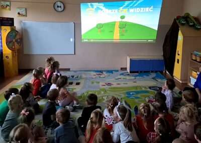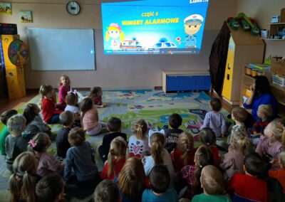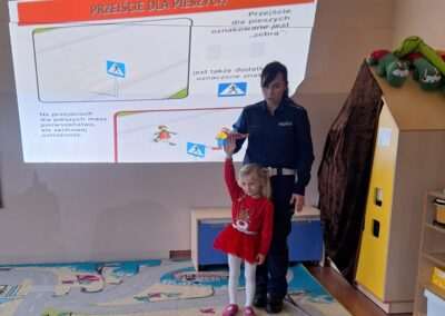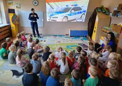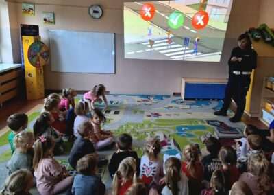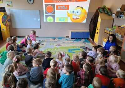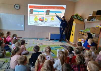 Podczas spotkania przedszkolaki rozmawiały o prawidłowym zachowaniu na drodze: przechodzeniu przez ulicę i dbaniu o odblaskowe elementy podczas spacerów po zmroku. Dzieci utrwaliły także numery alarmowe. Celem zorganizowanego spotkania było utrwalenie zasad bezpieczeństwa w ruchu drogowym.