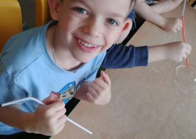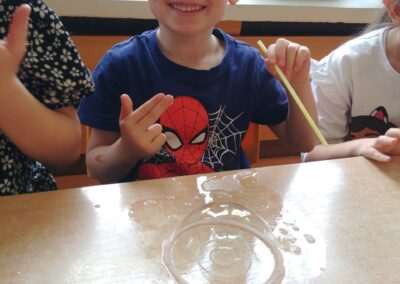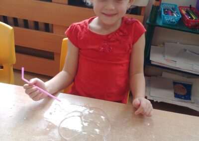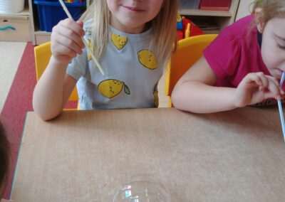 W ramach cotygodniowych zajęć sensorycznych dziś nasze przedszkolaki miały okazje robić eksperyment „Bańka w bańce”. Najpierw „wydmuchali” na stół sporą bańkę, później za pomocą słomki do napojów ( wcześniej zmoczonej w płynie do baniek mydlanych) przebili bardzo ostrożnie swoją bańkę, a następnie dmuchnęli w nią by powstała kolejna bańka. Zapraszamy do obejrzenia galerii zdjęć…