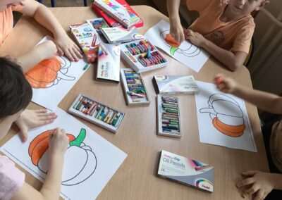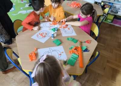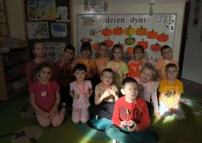 W miniony czwartek obchodziliśmy Dzień Dyni. Ubraliśmy się na pomarańczowo i wesołym krokiem wchodziliśmy rano do sali, czekając co nasze panie przygotowały na ten dzień. Słuchaliśmy wiersza o dyni, tańczyliśmy do piosenki „Dynia dana” oraz przechodziliśmy tor przeszkód z dyniami slalomem. Mieliśmy nawet wyścigi, gdzie musieliśmy trzymać dynię opuszkami palców lub jedną dłonią. Później pani Asia podzieliła nas na drużyny do pracy plastycznej- jedna drużyna rozcierała na obrazku dyni pomarańczową i zieloną plastelinę, druga robiła małe kuleczki z bibuły, a trzecia kolorowała dynię pastelami. Każda praca była inna i wyjątkowa. Na koniec obchodów dostaliśmy medale i zrobiliśmy pamiątkowe zdjęcie. Fajny był ten Dzień Dyni 🙂