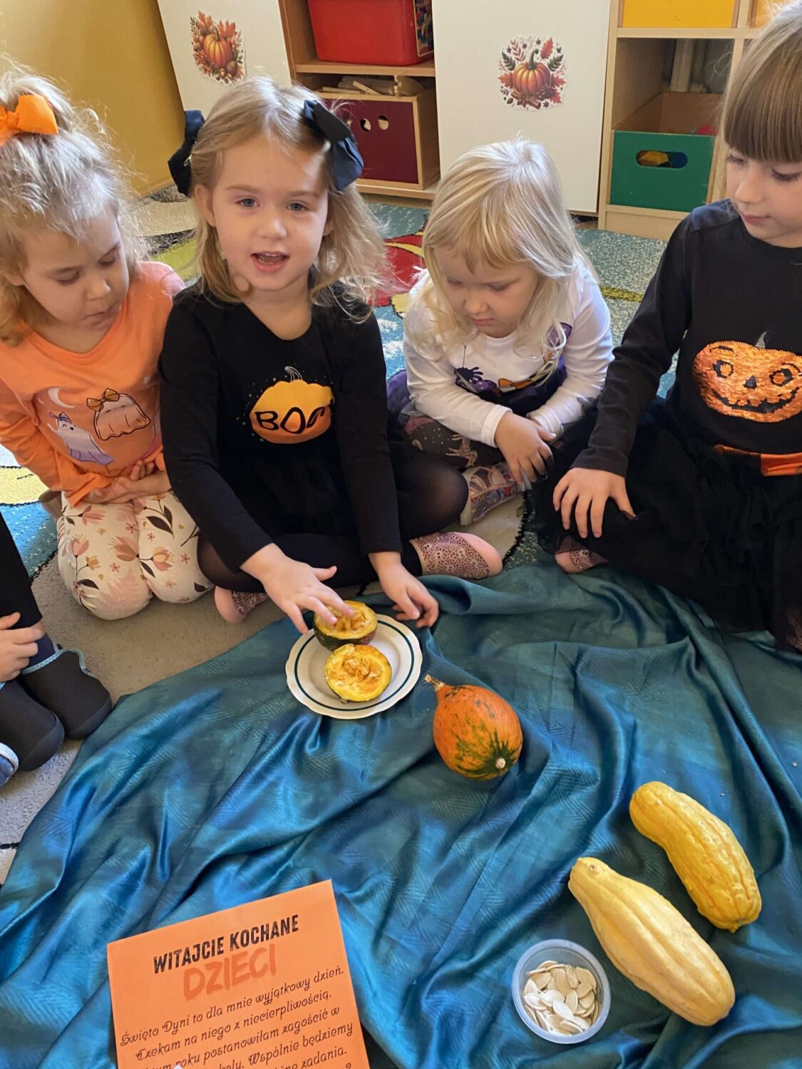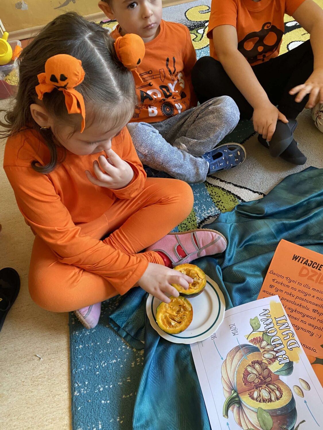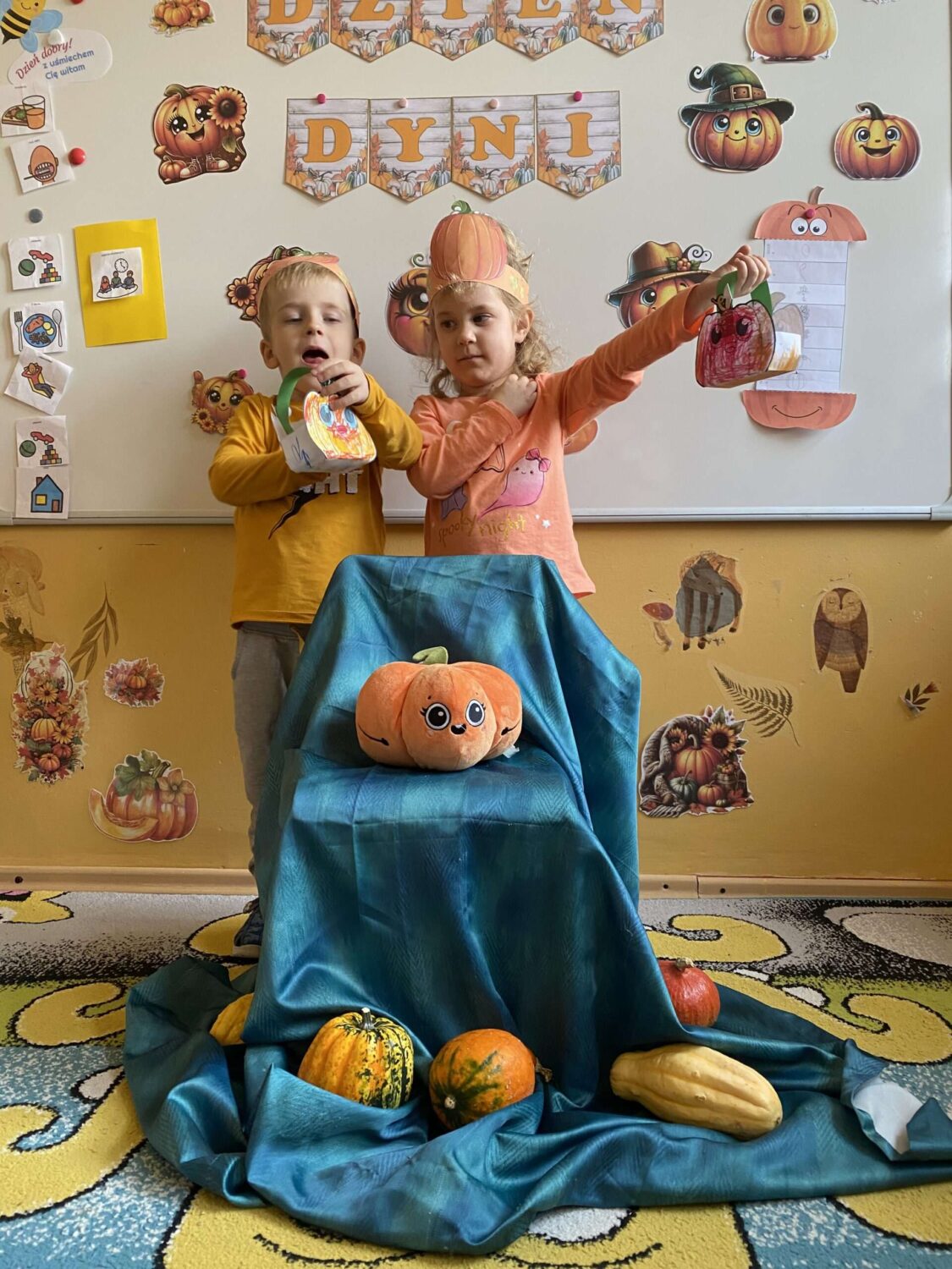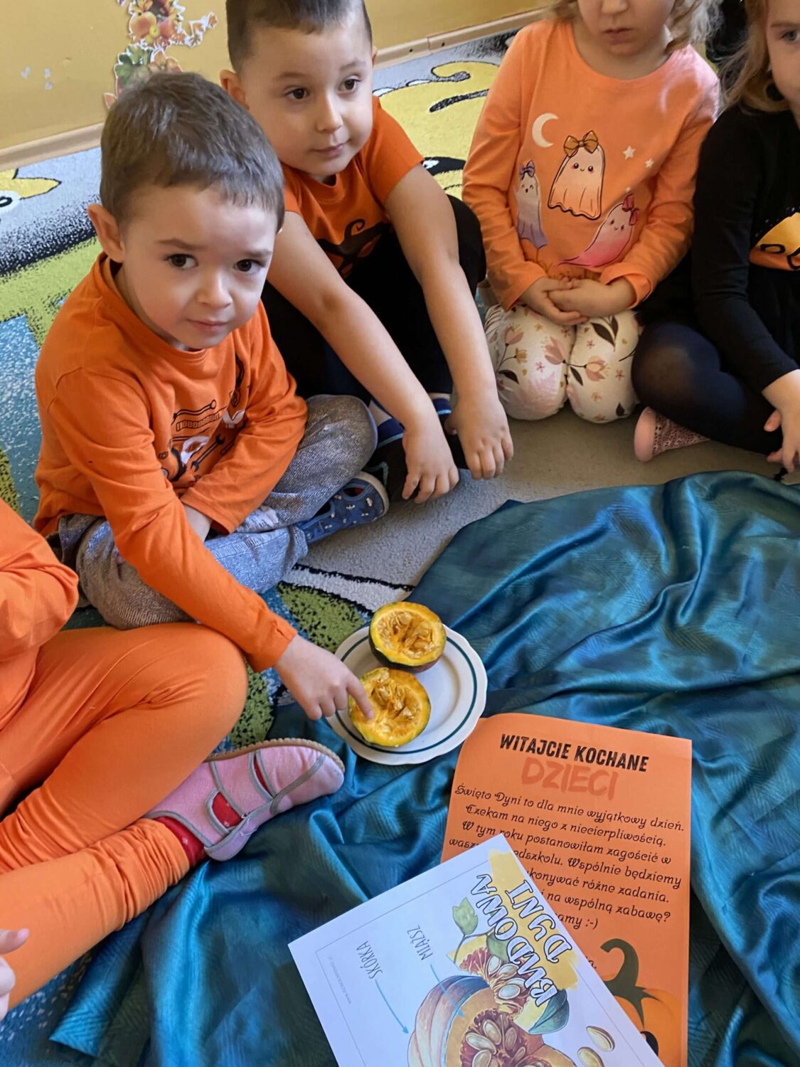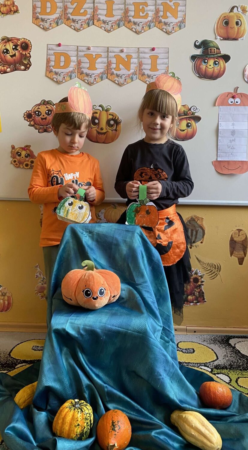 Grupa Pszczółek obchodziła wesoły i kolorowy Dzień Dyni! Tego dnia dzieci przyszły ubrane w odcienie pomarańczu. Podczas zajęć przedszkolaki: poznały ciekawostki o dyni, skąd pochodzi, jak rośnie i do czego można ją wykorzystać, wykonywały kreatywne prace plastyczne z dynią w roli głównej, uczestniczyły w dyniowych grach i zabawach ruchowych,
