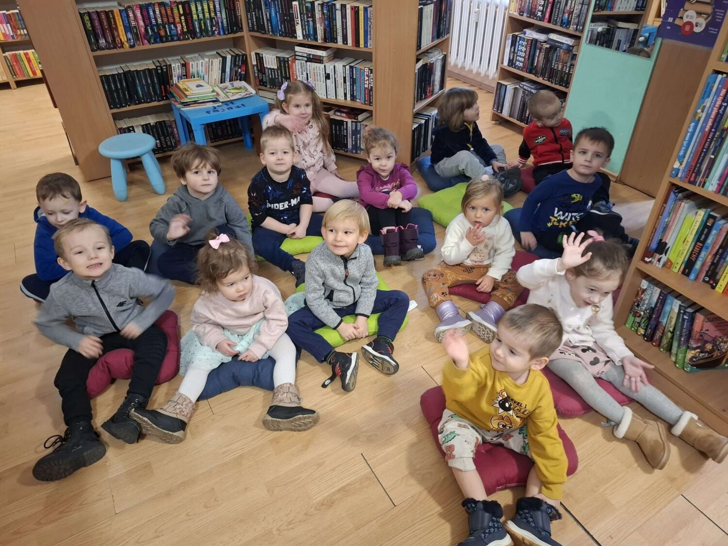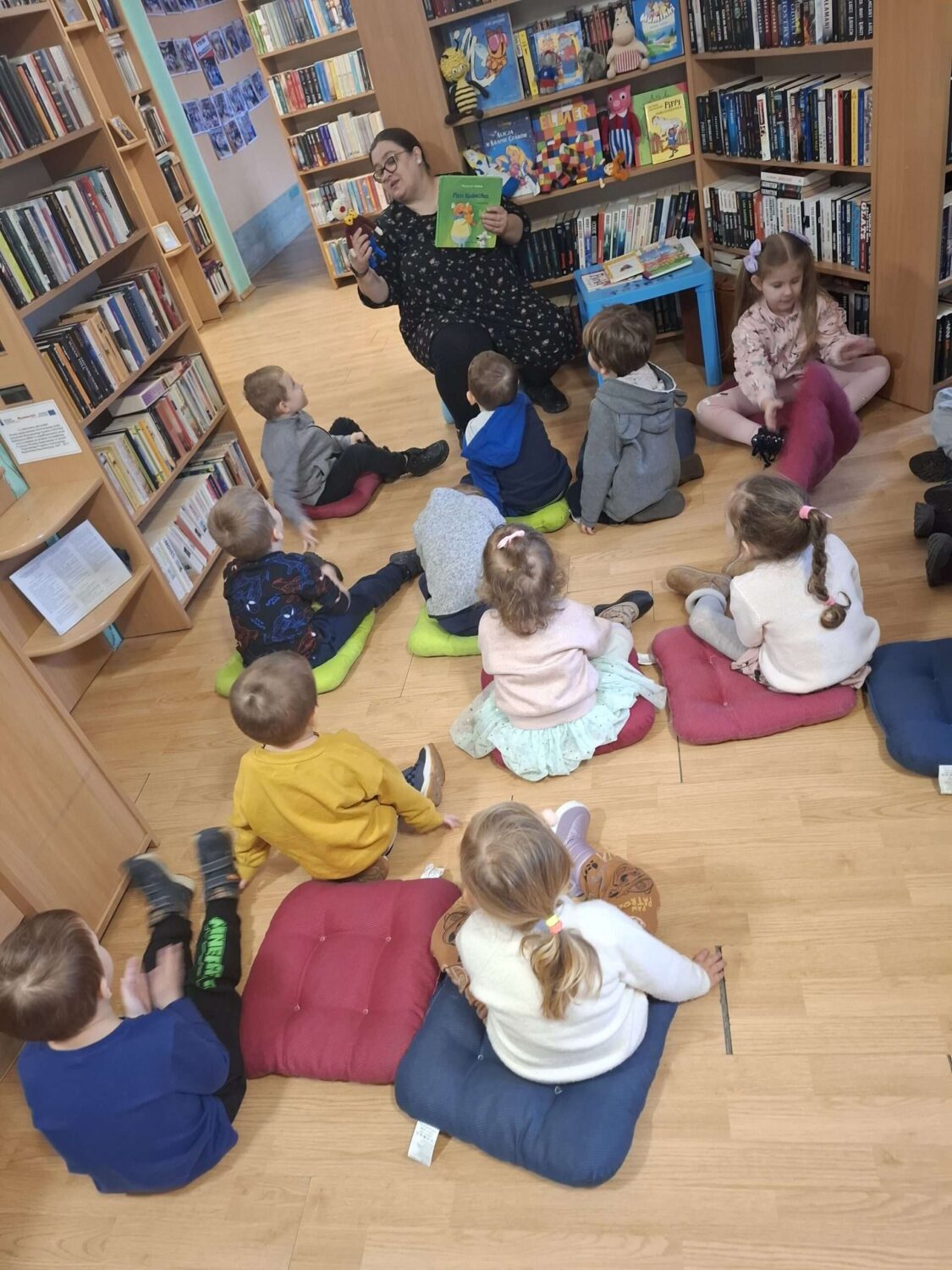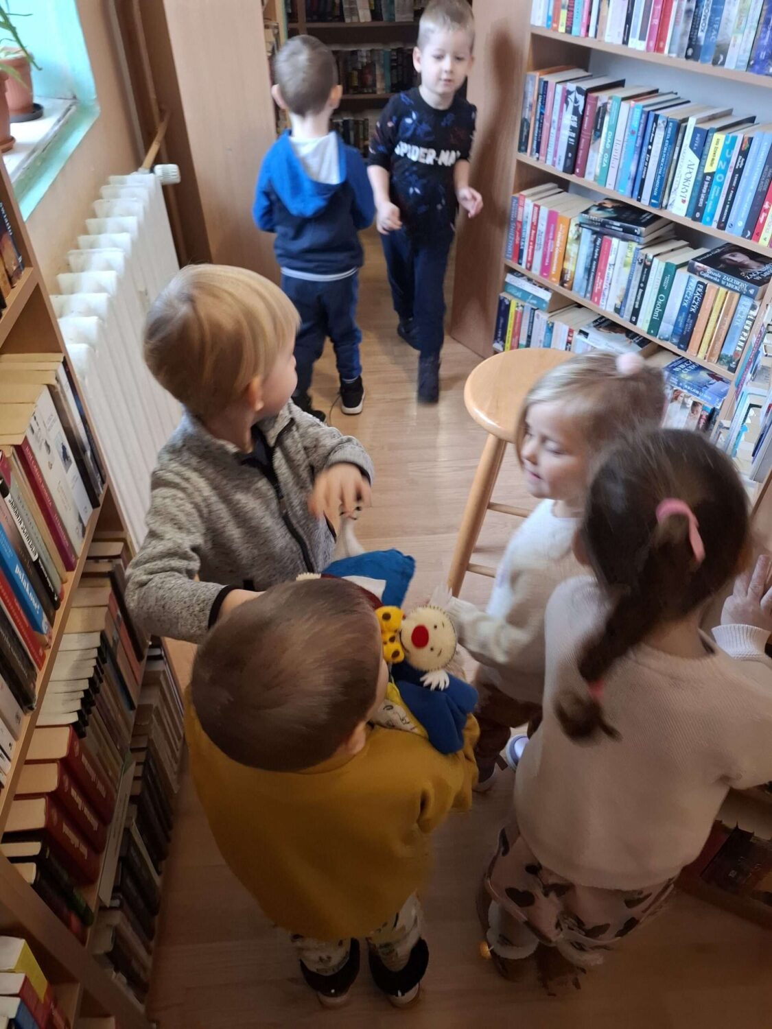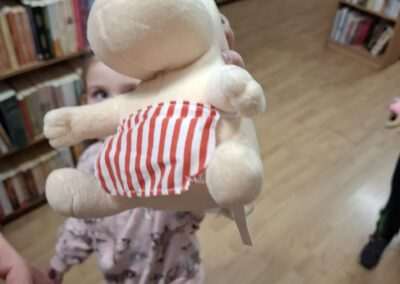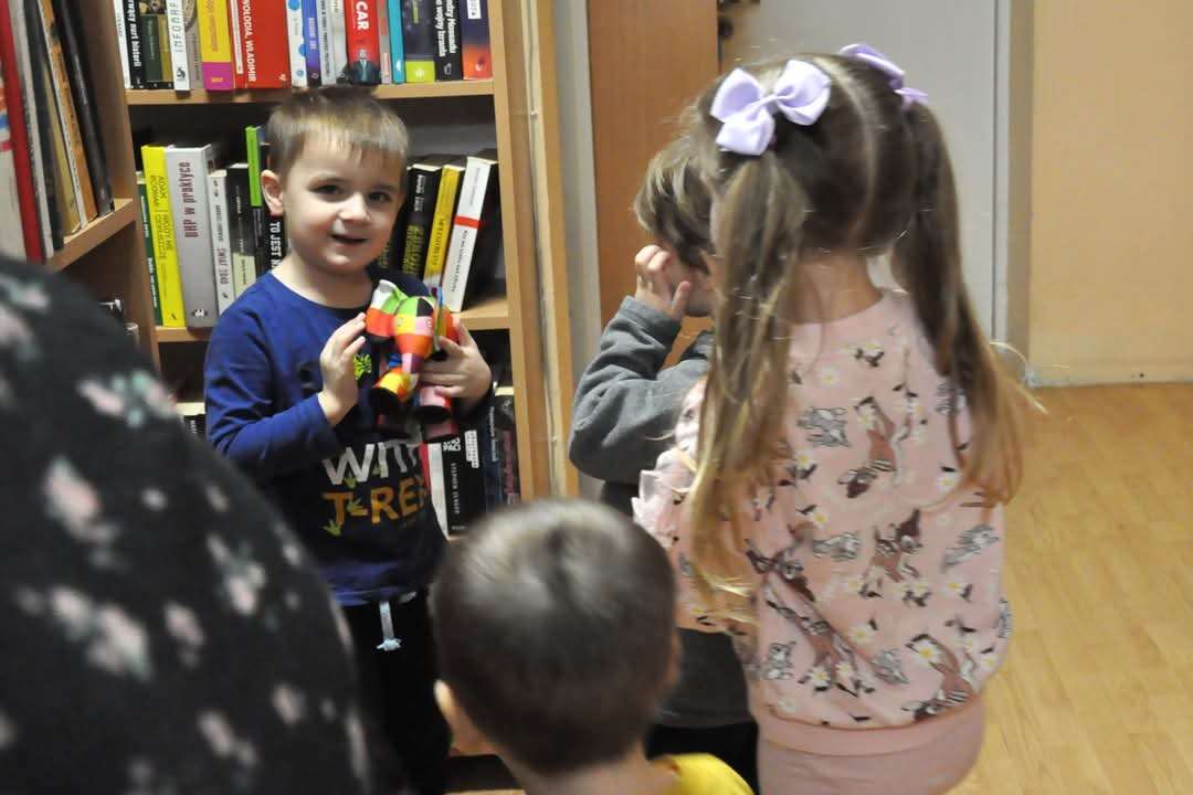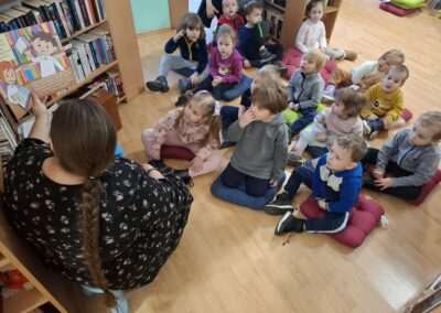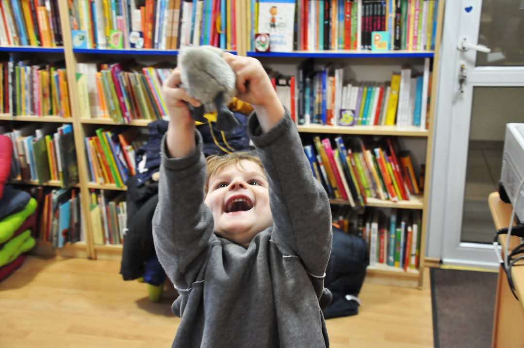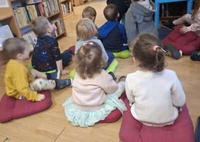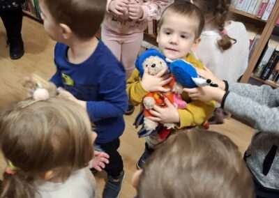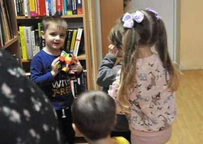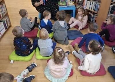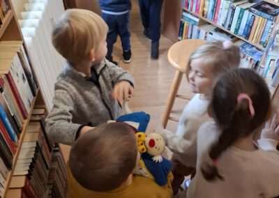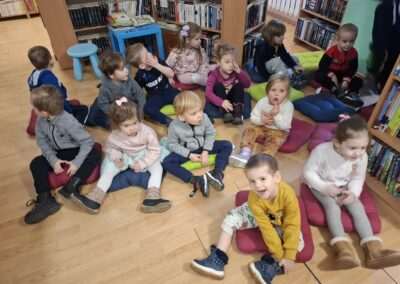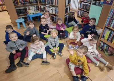 Dziś nasze motylki miały okazje po raz kolejny odwiedzić pobliską bibliotekę, tym razem na prawdziwej „lekcji bibliotecznej”. Najpierw mogli pozwiedzać bibliotekę, pooglądać książki, potem z zaciekawieniem słuchali książeczki „Bajka o odkurzaniu książek”. Następnie mieli bardzo ciekawe zadanie, a mianowicie musieli odnaleźć ukryte wśród książek na półkach postaci z popularnych książek dla dzieci. Zabawy i śmiechu było co niemiara.