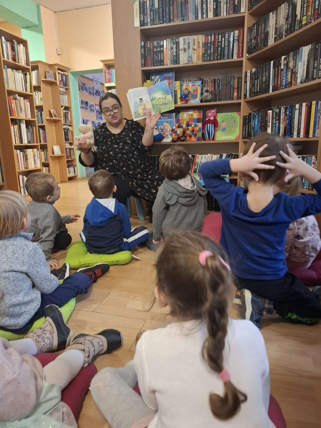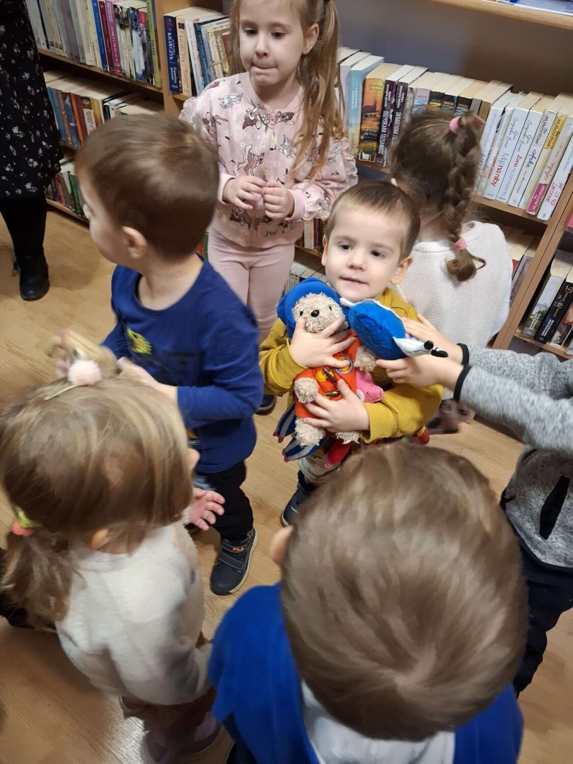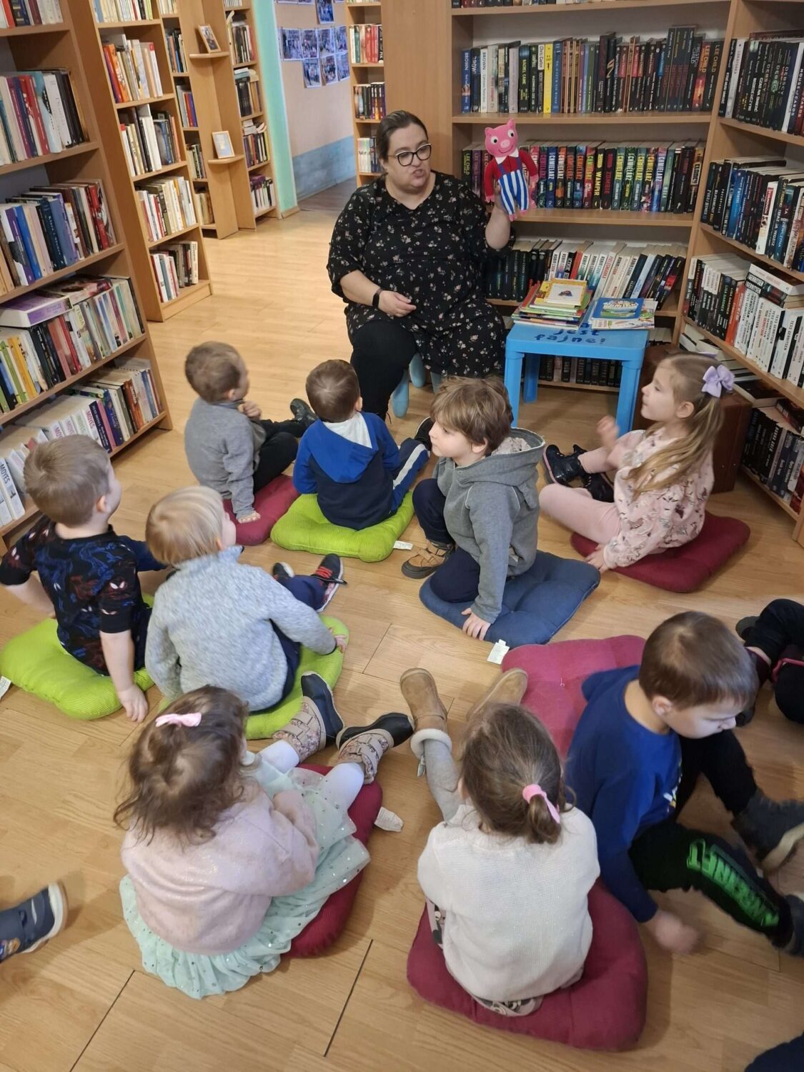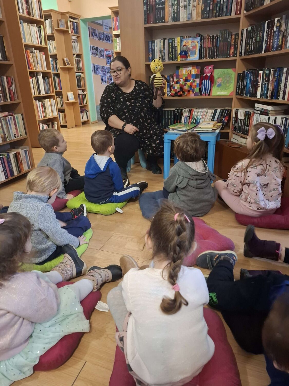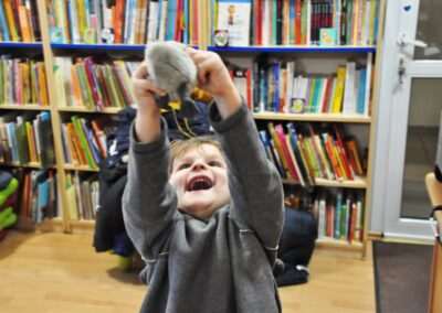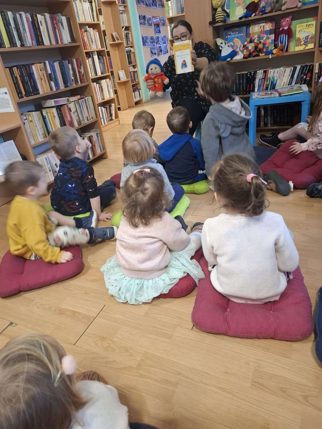 Dziś nasze motylki miały okazje po raz kolejny odwiedzić pobliską bibliotekę, tym razem na prawdziwej „lekcji bibliotecznej”. Najpierw mogli pozwiedzać bibliotekę, pooglądać książki, potem z zaciekawieniem słuchali książeczki „Bajka o odkurzaniu książek”. Następnie mieli bardzo ciekawe zadanie, a mianowicie musieli odnaleźć ukryte wśród książek na półkach postaci z popularnych książek dla dzieci. Zabawy i śmiechu było co niemiara.
