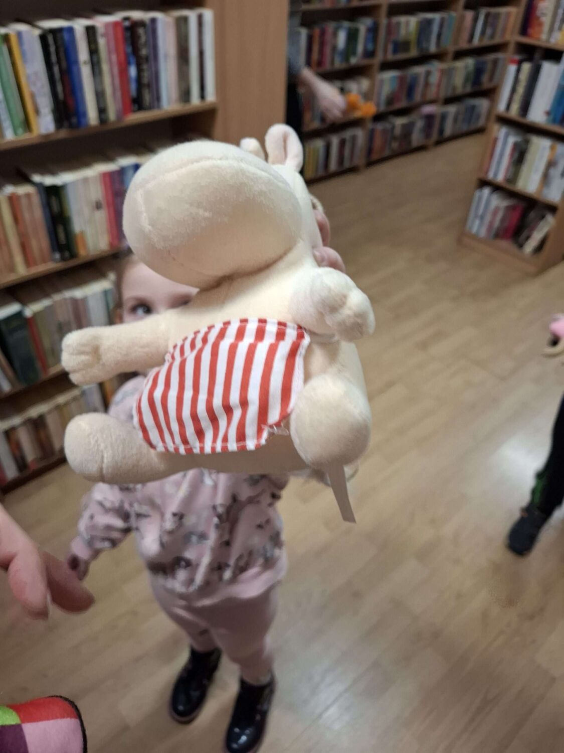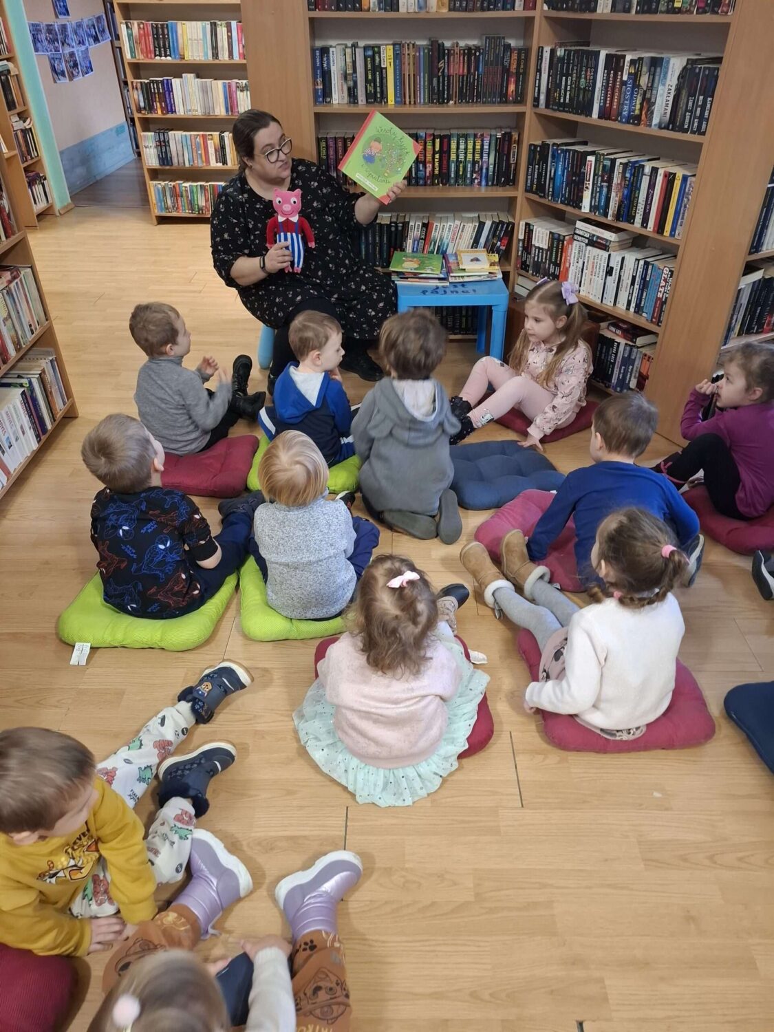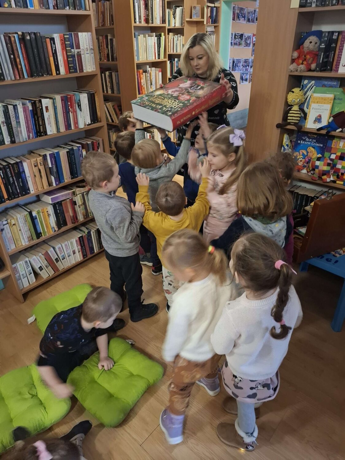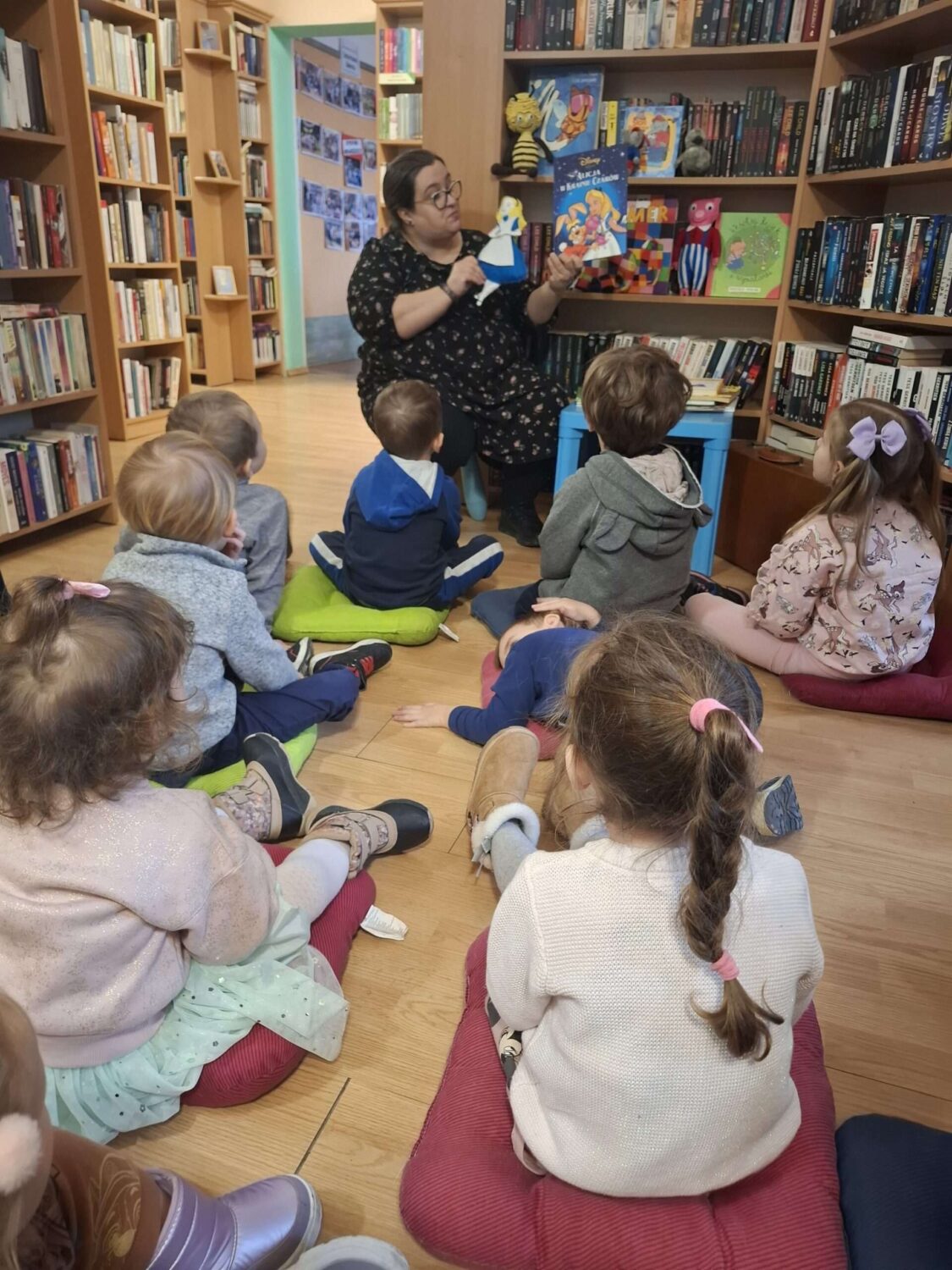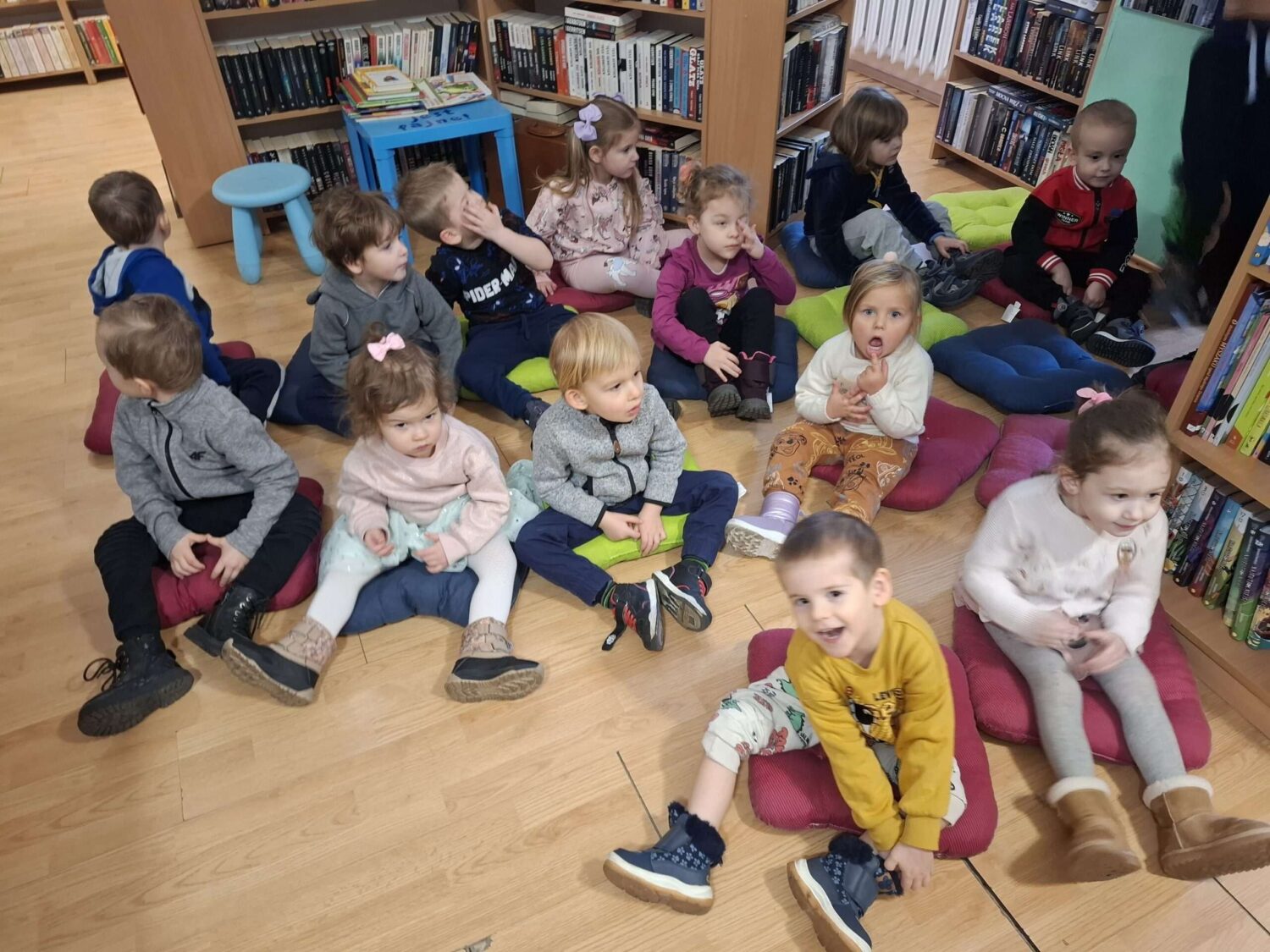 Dziś nasze motylki miały okazje po raz kolejny odwiedzić pobliską bibliotekę, tym razem na prawdziwej „lekcji bibliotecznej”. Najpierw mogli pozwiedzać bibliotekę, pooglądać książki, potem z zaciekawieniem słuchali książeczki „Bajka o odkurzaniu książek”. Następnie mieli bardzo ciekawe zadanie, a mianowicie musieli odnaleźć ukryte wśród książek na półkach postaci z popularnych książek dla dzieci. Zabawy i śmiechu było co niemiara.