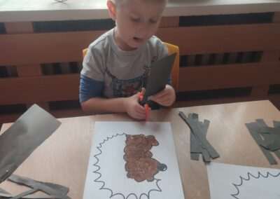 10 listopada obchodzimy Międzynarodowy Dzień Jeża z tej okazji dzieci z naszej grupy tworzyły piękne prace przedstawiające jeże. Najpierw kolorowały obrazek, potem wycinały paski z papieru kolorowego, by następnie z nich stworzyć „kolce” jeża.