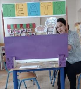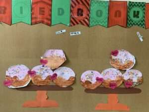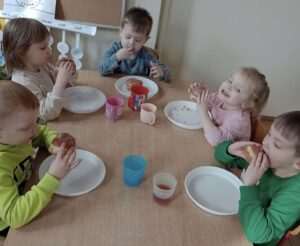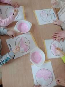 Od lat jak tradycja każe w TŁUSTY CZWARTEK na pierwszy plan wyłaniają się pyszne pączki i faworki. My w tym dniu obejrzeliśmy teatrzyk na podstawie utworu M. Konopnickiej, dowiedzieliśmy się skąd bierzemy mąkę, czym zajmuje sie młynarz, pomalowaliśmy farbami sylwety pączków. W czasie kiedy one schły my zajadaliśmy się pysznymi, słodkimi pączusiami. Samodzielnie wycięte pączki stworzyły cieszącą oko dekorację sali.