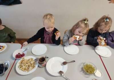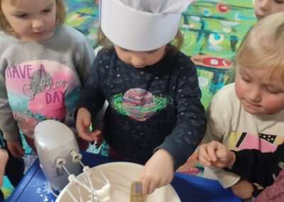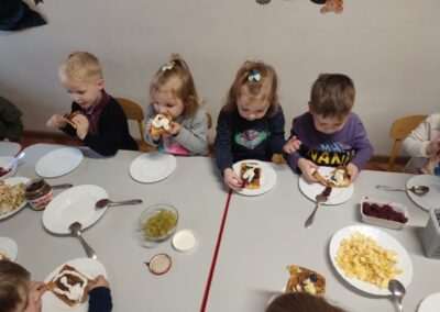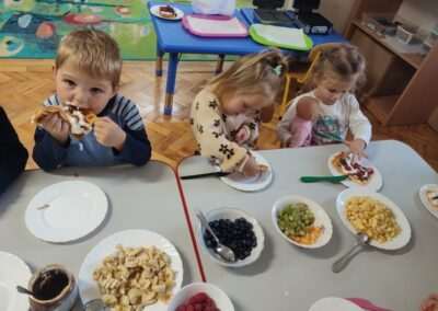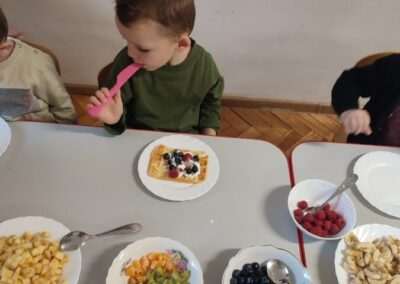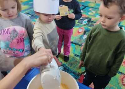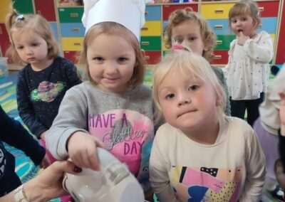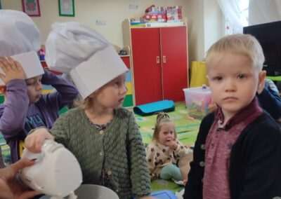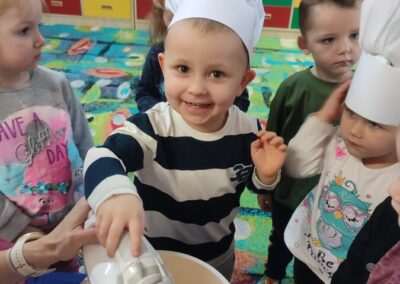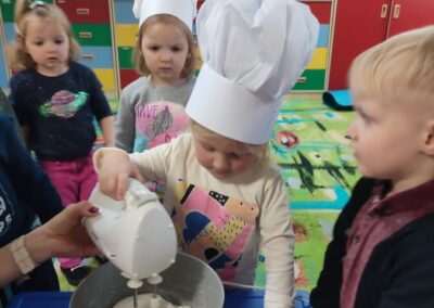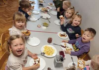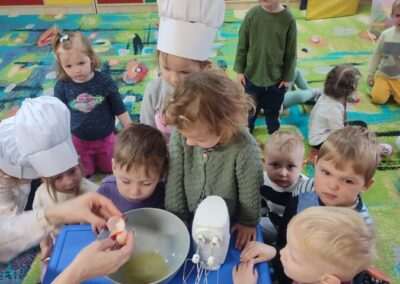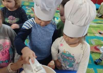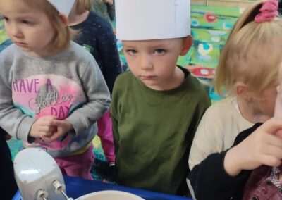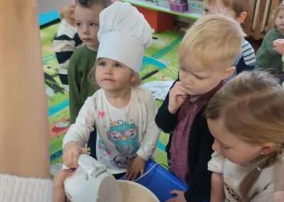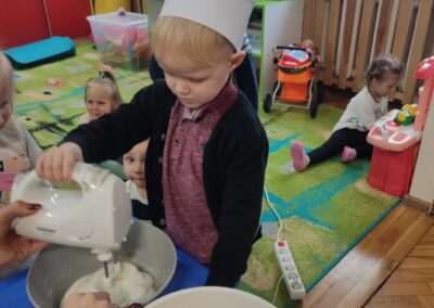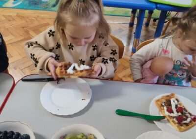 Dnia 4.11.2022r. w grupie XII i XIII odbyły się warsztaty cukiernicze – pieczenie gofrów. Najpierw dzieci poznały zasady higieny pracy oraz bezpieczeństwa podczas korzystania z urządzeń elektrycznych” gofrownicy, miksera. Każdy przedszkolak z dokładnością wsypywał bądź wlewał składniki, by później dobrze je wymieszać. Dzieci z niecierpliwością czekały aż gofry będą gotowe. Wszędzie unosił się wspaniały aromat pieczonego ciasta. Każdy mógł sam zdecydować z czym będzie je jadł. Gofry były tak pyszne, że co niektórzy skorzystali z dokładki. Nasze przedszkolaki uwielbiają takie kulinarne zajęcia, ponieważ to sama przyjemność spożywać to, co się samodzielnie przygotowało. Podsumowując można stwierdzić, że było słodko i smacznie!:)