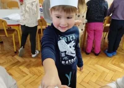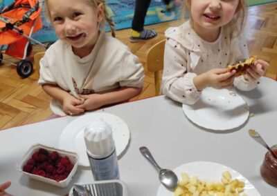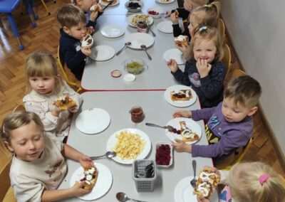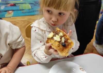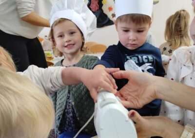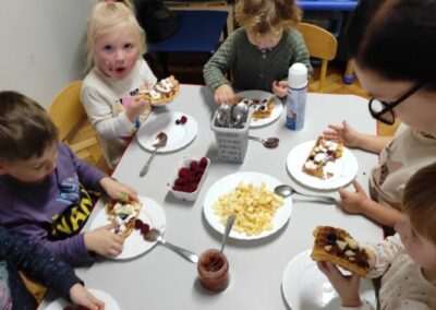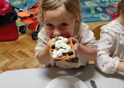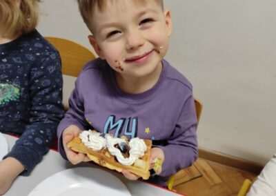Dnia 4.11.2022r. w grupie XII i XIII odbyły się warsztaty cukiernicze- pieczenie gofrów. Najpierw dzieci poznały zasady higieny pracy oraz bezpieczeństwa podczas korzystania z urządzeń elektrycznych: gofrownicy, miksera. Każdy przedszkolak z dokładnością wsypywał bądź wlewał składniki, by później dobrze je wymieszać. Dzieci z niecierpliwością czekały aż gofry będą gotowe. Wszędzie unosił się wspaniały aromat pieczonego ciasta. Każdy mógł sam zdecydować z czym będzie je jadł. Gofry były tak pyszne, że co niektórzy skorzystali z dokładki. Nasze przedszkolaki uwielbiają takie kulinarne zajęcia, ponieważ to sama przyjemność spożywać to, co się samodzielnie przygotowało. Podsumowując można stwierdzić, że było słodko i smacznie!:)