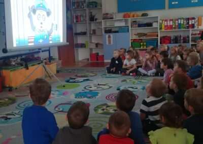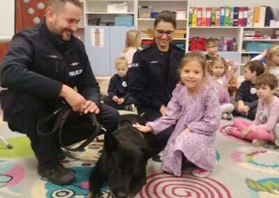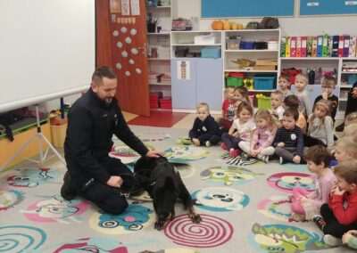 W dniu dzisiejszym nasze przedszkolaki miały okazję spotkać się z funkcjonariuszem policji z Wydziału Ruchu Drogowego. Dzieci z zainteresowaniem oglądały film edukacyjny dotyczący bezpiecznych zachowań w ruchu drogowym i w kontaktach z nieznajomymi, Miały możliwość przymierzenia czapki policyjnej oraz zapoznania się z różnymi akcesoriami służącymi funkcjonariuszom w ich codziennej pracy. Dodatkową atrakcją dla dzieci było spotkanie z psem policyjnym, którego dzieci mogły pogłaskać i poznać jego plan dnia.