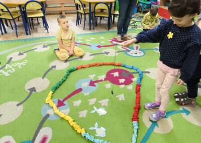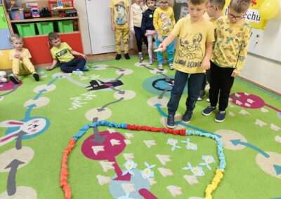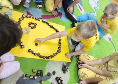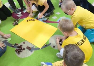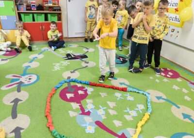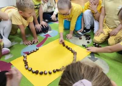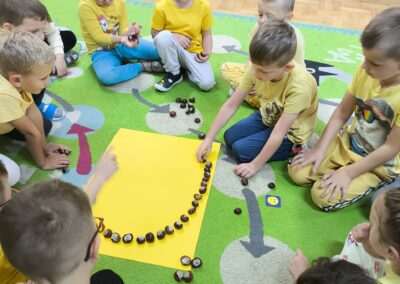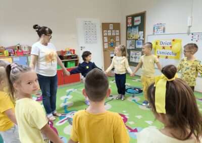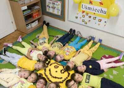 Pani Kasia dała nam niełatwe zadanie- mieliśmy się nie śmiać, kiedy mówiła coś nam śmiesznego. Jak mieliśmy się nie śmiać, jak u jednego z nas podobno wyrosły pomidory na plecach?! Aż brzuchy nas bolały od tych śmiesznych powiedzonek! Dostaliśmy też wędki i łowiliśmy rybki, które miały narysowane uśmiechy i one nie zawsze chciały się złapać! Na zakończenie świętowania każdy z nas miał okazję ułożyć kilka kasztanów i z tego powstała buzia. I oto możemy zobaczyć te zdjęcia z tego dnia! Ale to był wesoły dzień!