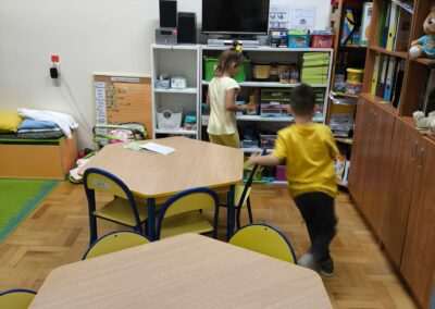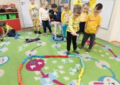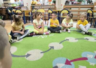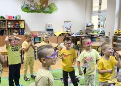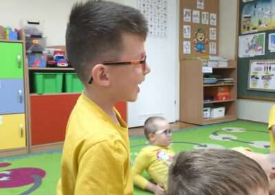 z uśmiechem, ale to było przyjemne i od razu mieliśmy dobre humory! Później wzięliśmy w dłoń mikrofon i mówiliśmy do osoby obok coś miłego, co było też bardzo fajne. Zamieniliśmy się też na chwilę w detektywów i szukaliśmy po sali samych obrazków z uśmiechem wśród obrazków z różnymi emocjami.