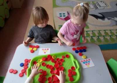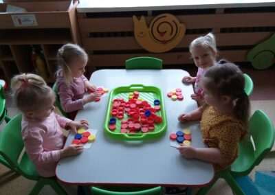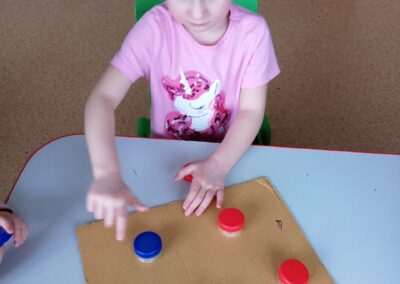 Nasze „Zabawy bez zabawek – zabawy kolorowymi korkami” podczas których usprawniamy płynność ruchów rączek, nadgarstka, paluszków.